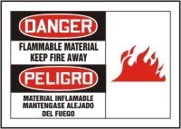 Bilingual & Spanish Only Safety Signs. DANGER FLAMMABLE MATERIAL KEEP FIRE AWAY (W/GRAPHIC) (BILINGUAL). 10" x 14" Adhesive Vinyl Sign