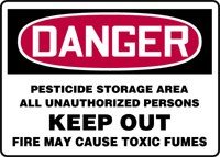 Chemical & Hazardous Material Safety Signs. DANGER PESTICIDE STORAGE AREA ALL UNAUTHORIZED PERSONS KEEP OUT FIRE MAY CAUSE TOXIC FUMES. 10" x 14" Aluminum Sign