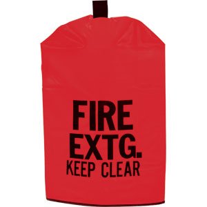 - Red Fire Extinguisher Covers are made of reinforced vinyl with hook-and-loop closures and clearly labeled with large, black imprint and black trim. Fit portable, pressurized and cartridge-operated extinguishers. Heavy-Duty, Fire Extinguisher Covers should last an average of five years outside in normal conditions.