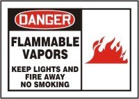 Chemical & Hazardous Material Safety Signs. DANGER FLAMMABLE VAPORS KEEP LIGHTS AND FIRE AWAY NO SMOKING (W/GRAPHIC). 7" x 10" Aluminum Sign